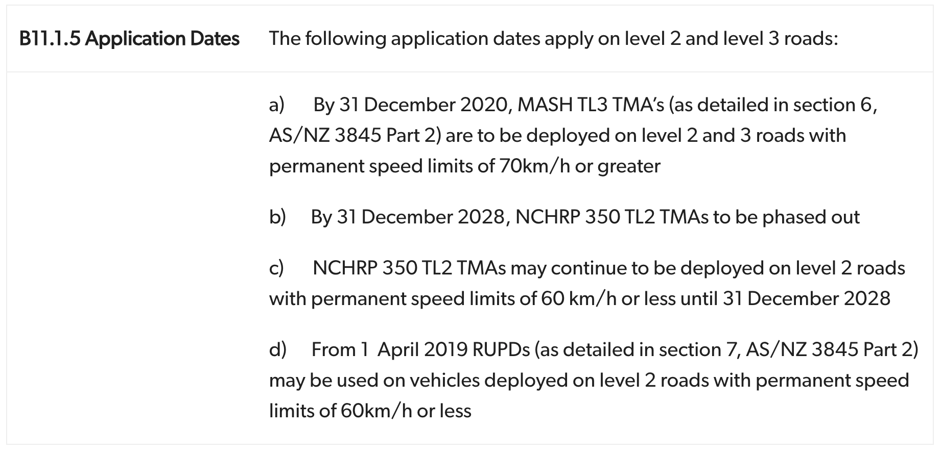 The NCHRP 350 product can no longer be used above 70km/h and is only able to be used on roads with permanent speeds at 60km/h or lower. Furthermore, after 31st December 2028, the NCHRP 350 product will no longer be compliant for use on level 2 roads which will in essence discontinue it from practical use.