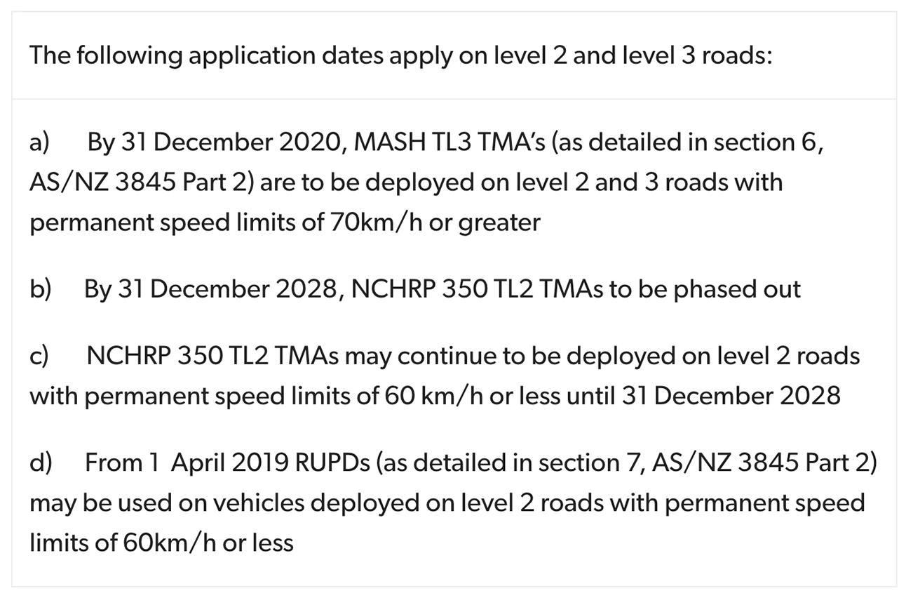 The changes specifically relate to Level 2 & 3 roads that now call for crash pads (TMAs) to be accredited to MASH TL-3 standard when being used on roads with a permanent speed limit of 70km/h or greater. This is quite significant because for the past 20 years a widely used crash pad has been a NCHRP 350 TL-2 rated product which was able to be used on roads exceeding 70km/h.
