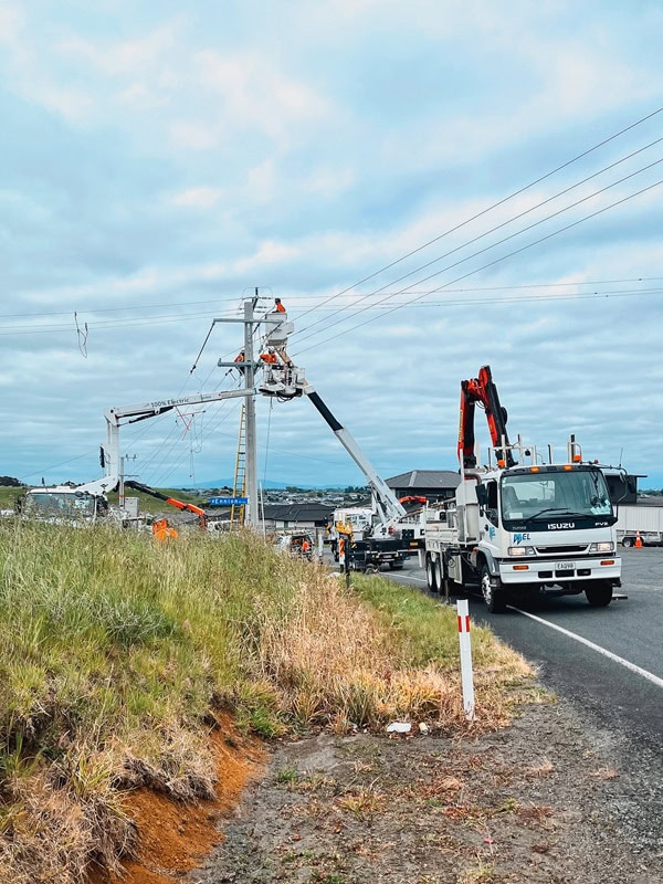 Waimea-built specialist utility vehicles replacing a power pole in Hamilton
